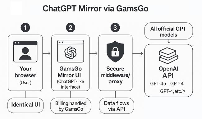 The third option GamsGo offers is something called ChatGPT Mirror. This one is a bit different - you’re not logging into an official ChatGPT account at all. Instead, GamsGo provides you with a special web-based interface that “mirrors” the official ChatGPT, complete with GPT-5 and all the Plus features. You access it through GamsGo’s site (or a provided link) with your GamsGo account, and it works just like ChatGPT - but at an even lower cost per month.