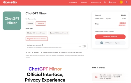 Pros: The biggest pro here is cost-effectiveness combined with privacy. This option was even cheaper per month than the shared account. At the time of writing, the price on GamsGo for Mirror was advertised around $3.68/month (versus $20 officially). That’s incredibly cheap given you still get all the Plus perks. And since you’re not sharing the environment with anyone, you don’t have the privacy concerns of the shared account. Another benefit: no need for an OpenAI account at all - which is great if you were having trouble creating one or getting the payment through on OpenAI’s side. It’s essentially plug-and-play; GamsGo provides the service directly in your browser with one click.