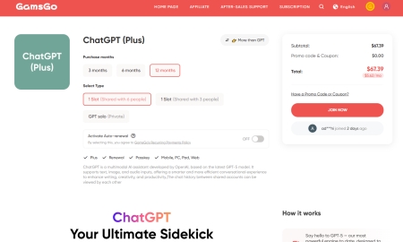 ChatGPT Plus offers fantastic features like GPT-5 access, faster responses, and new tools - but its $20/month price can feel steep. As someone who relies on ChatGPT for work and learning, I started searching for a cheaper way to enjoy those Plus benefits. That’s when I discovered GamsGo, a subscription-sharing platform that lets you get ChatGPT Plus at a fraction of the normal cost. GamsGo is well-known for providing affordable access to premium services (Netflix, Spotify, etc.), and it turns out they have solutions for ChatGPT Plus too.