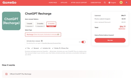 “ChatGPT Recharge” on GamsGo allows you to upgrade your personal ChatGPT account to Plus status, but at a cheaper rate than paying OpenAI directly. Essentially, GamsGo handles the payment through their channels (often at regional discounts or bulk rates) and “recharges” your account with a Plus subscription.