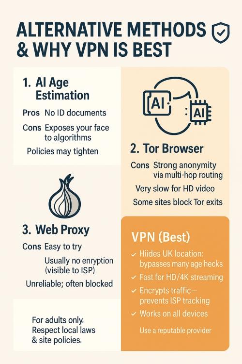 Another option is to use a web proxy service. A proxy server can make it appear as though you’re browsing from another country by relaying your traffic through its own IP address. However, most free proxies do not encrypt your connection, so your ISP and others could still see what pages you’re visiting. Many proxy sites are also unreliable or loaded with intrusive ads, and popular adult platforms tend to ban or block them for abuse. In short, alternatives like AI-based age estimators, Tor, or proxies either compromise on privacy, speed, or consistency of access.